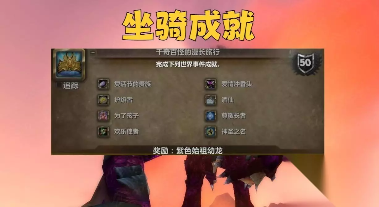 WLK版本有一个成就名为《千奇百怪的漫长旅行》,玩家做完这个成就便可以获得一款紫色始祖幼龙,这款坐骑是除了JJC和团本之外唯一获得310%坐骑的机会。而这个成就中就包含美酒节期间的成就。