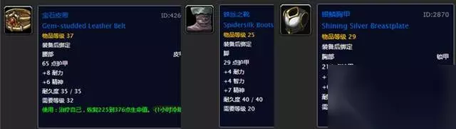 三个蓝色装备 这三件装备还是可以做点卖的,尤其是银鳞胸甲,玩怀旧服的玩家很多都看过《我叫MT》这个动画片,受里边奸商小德走到哪广告就打到哪的影响,银鳞胸甲还是有一定市场的。