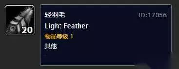 轻羽毛 一、轻羽毛:留着放拍卖行,1根5银币左右,卖商给NPC价格7个铜币1根。 这个羽毛的爆率还是很高的,大多数30级以下的鸟类和鹰身人都有掉落。需求量还是非常大的,因为法师和牧师这2个职业的玩家非常多,轻羽毛是法师的缓落术和牧师的漂浮术的施法材料。