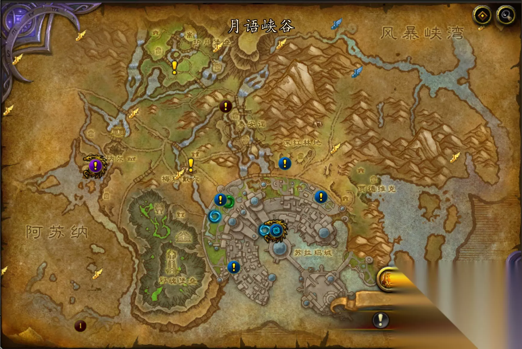 在 第二次战争时, 苏拉玛的一部分——沉没的萨格拉斯之墓,即现在的破碎海滩,被古尔丹从海底升起。一场战斗 在玛维·影歌的守望者和伊利丹的娜迦中打响。几年之后,军团派平行宇宙的古尔丹作为他们的使者招降夜之子和他们的领袖——大魔导师艾利桑德, 最终,艾利桑德与这些一万年前他们曾奋力反抗的恶魔达成了协议。然而并不是所有夜之子都服从利桑德的决定,但是他们把自己的不满藏在心底。艾利桑德的追随者和恶魔在苏拉玛城的街道力巡逻,恐惧和不信任在精灵之间滋生,家庭之间反目成仇。夏多雷种族在生死存亡的关头,必须有英雄们激励这些曾经勇敢的暗夜精灵崇高的心灵。 副本地图