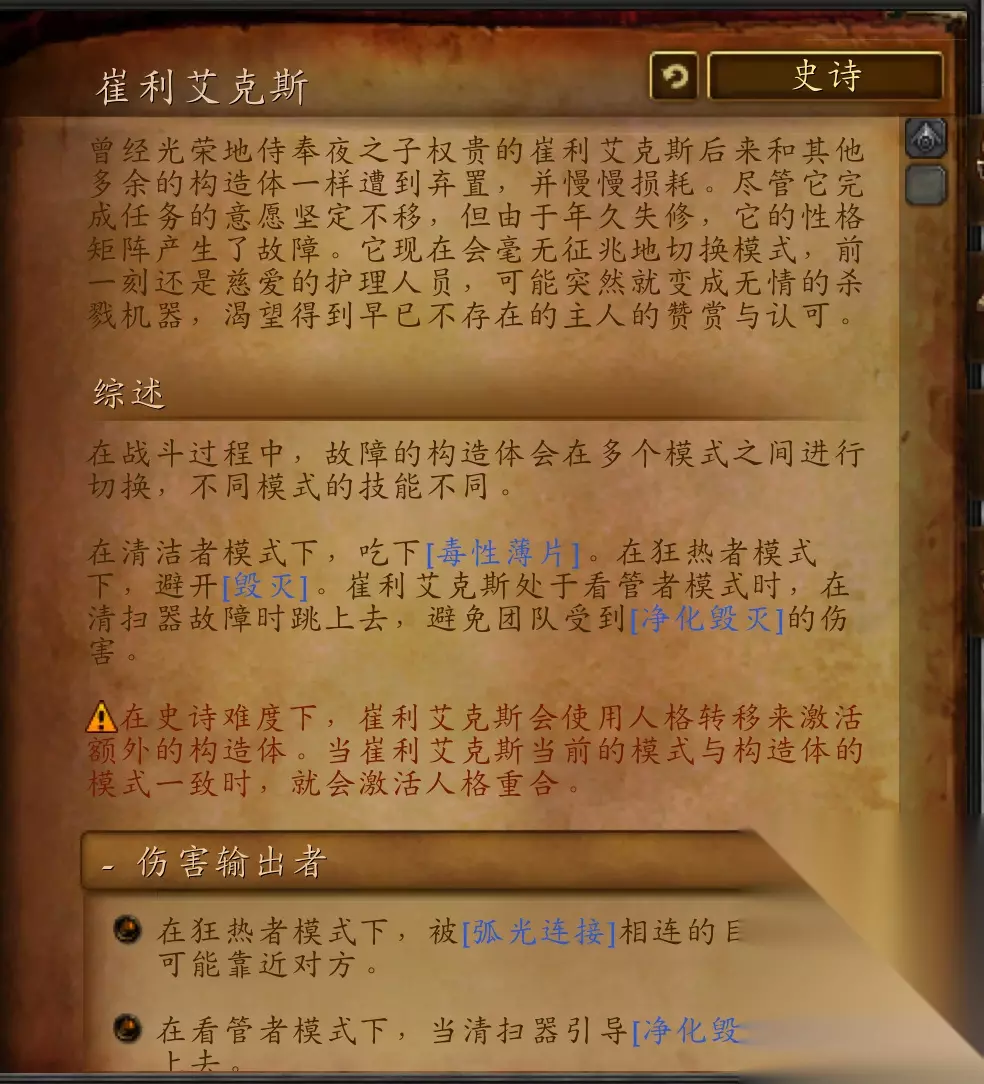 崔利艾克斯 曾经光荣地侍奉夜之子权贵的崔利艾克斯后来和其他多余的构造体一样遭到弃置,并慢慢损耗。尽管它完成任务的意愿坚定不移,但由于年久失修,它的性格矩阵产生了故障。