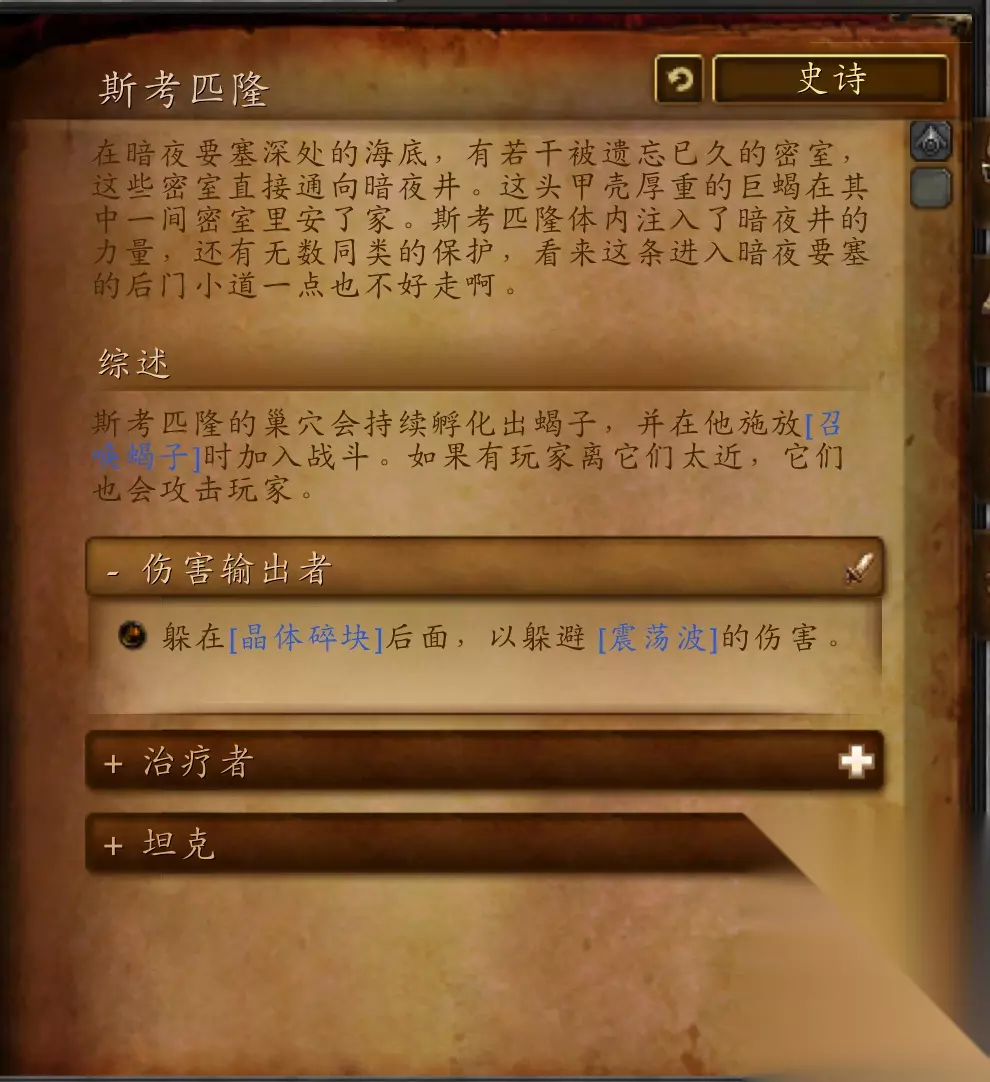 副本首领 斯考匹隆 斯考匹隆在暗夜要塞深处的海底,有若干被遗忘已久的密室,这些密室直接通向暗夜井。这头甲壳厚重的巨蝎在其中一间密室里安了家。斯考匹隆体内注入了暗夜井的力量,还有无数同类的保护,看来这条进入暗夜要塞的后门小道一点也不好走啊。