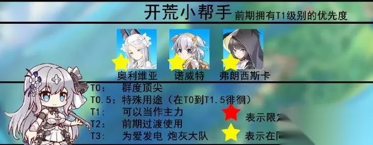 新手开荒角色推荐 1、水母、三幻神(耳机,雪莉,Lisa):这一系列对练度的要求不高,装备随便给,很容易培养开荒; 2、卡农:UB190%的倍率打前排3个并且禁疗,算是一个宝藏角色,新手开荒非常合适; 3、金鱼腐竹没五星别用,一个脆成纸一个没伤害,建议大家不要着重培养。
