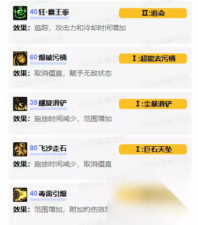 二、核心技能强化推荐 • 伏虎霸王拳 – 优先提升技能伤害 – 增强连招衔接能力 • 飞沙走石 – 提高范围伤害 – 增强控制效果 • 暗街夺命锁 – 提升单体爆发 – 延长控制时间