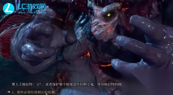 2、到达目的地以后,能够看见【蕈人王格拉特】坐到菌类上,惦记着哪些,点一下目标人物,开启故事情节会话,了解到了需要帮忙他击倒【蕈人王斯伯】。