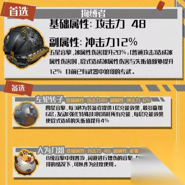 3、莱卡恩音擎推荐 最优选择是五星【拘缚者】,提升冰属性伤害,并且可以额外附加失衡值,在当前版本算是狼哥的专武。 前期过渡阶段可以选择【左轮转子】、【人为刀俎】