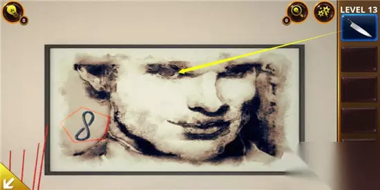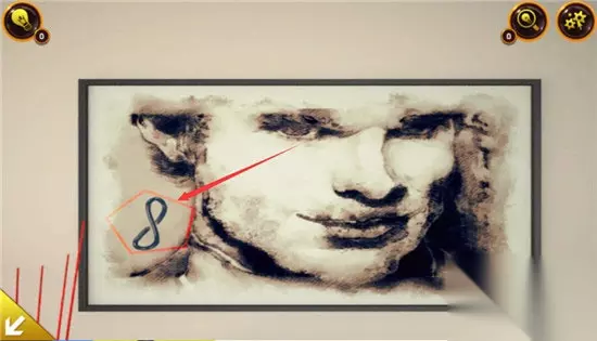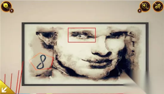 在墙上的那副画中可以得到一个数值“8”同时还要注意形状