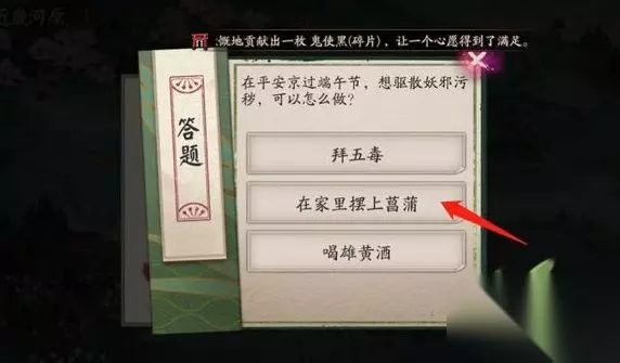 t15_2-t15_1:9.0 标签: 菖蒲 阴阳师想驱散妖邪污秽可以怎么做?端午节驱散妖邪污秽答案是什么?游戏在6月15日更新了全新的题目,那就是在平安京过端午节,想驱散妖邪污秽,可以怎么做?这道题目还是比较简单的,其答案一眼就可以看出来,接下来小编就为大家分享一下该题目的答案一览。