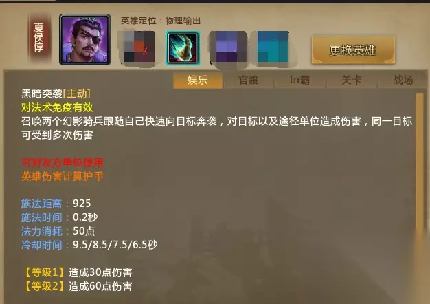 现在的节奏其实依然不太适合夏侯,虽然后期能力强,但是机动性上稍微差点,依赖自己的控制,伤害也有点拼脸,人品好晕人久,倍击伤害也高。e无视魔免,现在用来破后排输出的红甲简直太好用!推荐配合刘璋,贾诩等英雄,能把依赖御魔的c位针对到死!