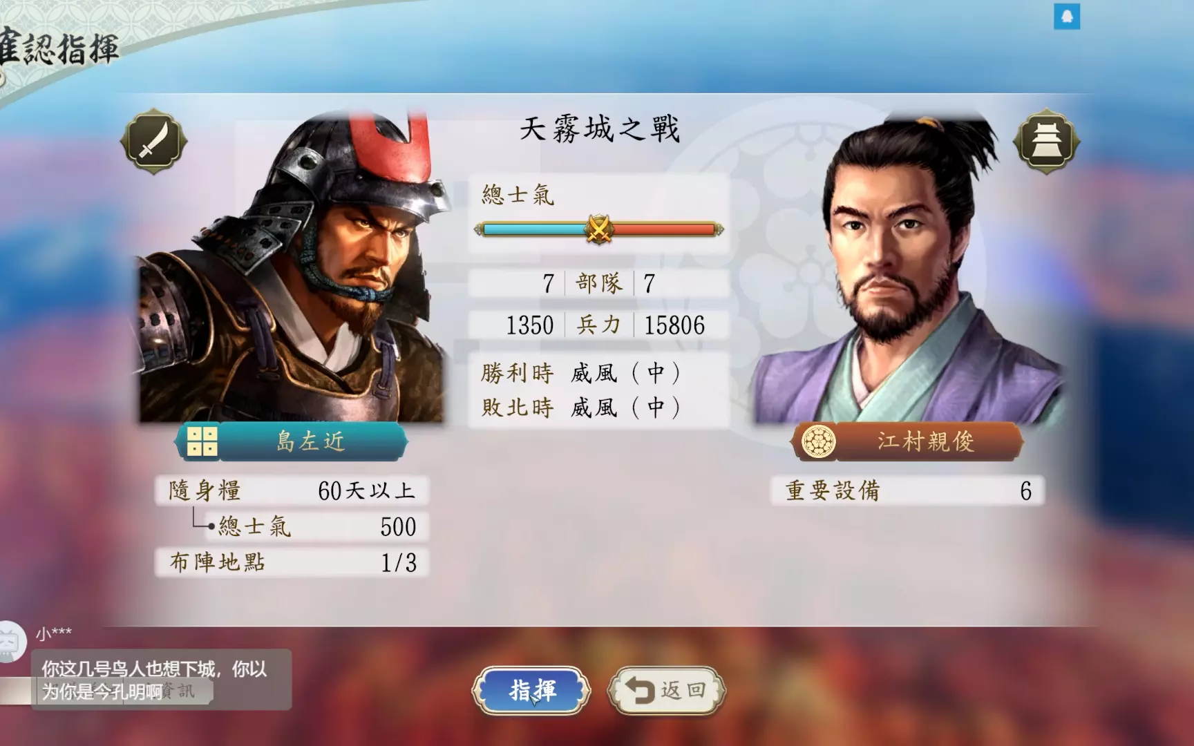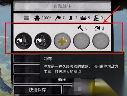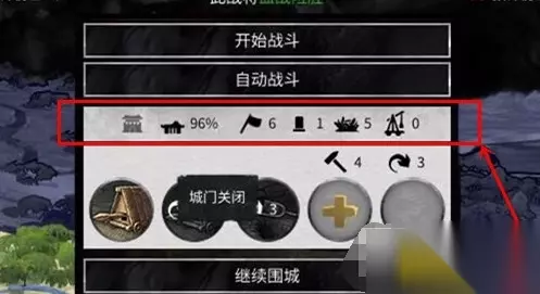 围城 在一统天下的过程中,我们经常会遇到一些围墙高竖的城镇,此时除非攻击军队携带了攻城器械,否则就不能立即攻击有围墙的郡国,如大城。 因此如果没有攻城器械的话,就需要先【围城】数回合,以便制造攻击方攻城器械。随着时间的推移,围城会让城中的百姓和守备军感到不安,但会消耗攻击方的军队补给。 当命令军队攻击某个郡国时,【围城】的面板和相关选项就会解锁,仔细查看这些选项和图标(将鼠标悬停在其上方)就可以了解当前关于围城的所有信息,有助于采取更加合适的战略。 图片中图标的含义从左至右依次为: