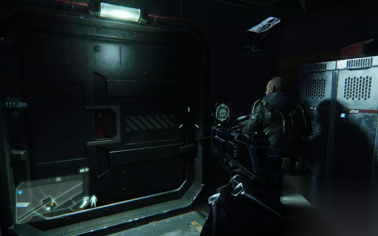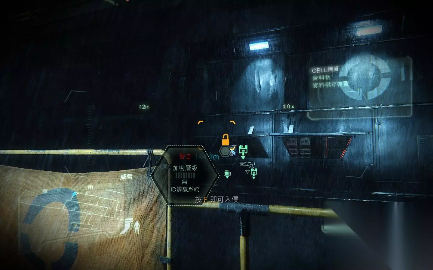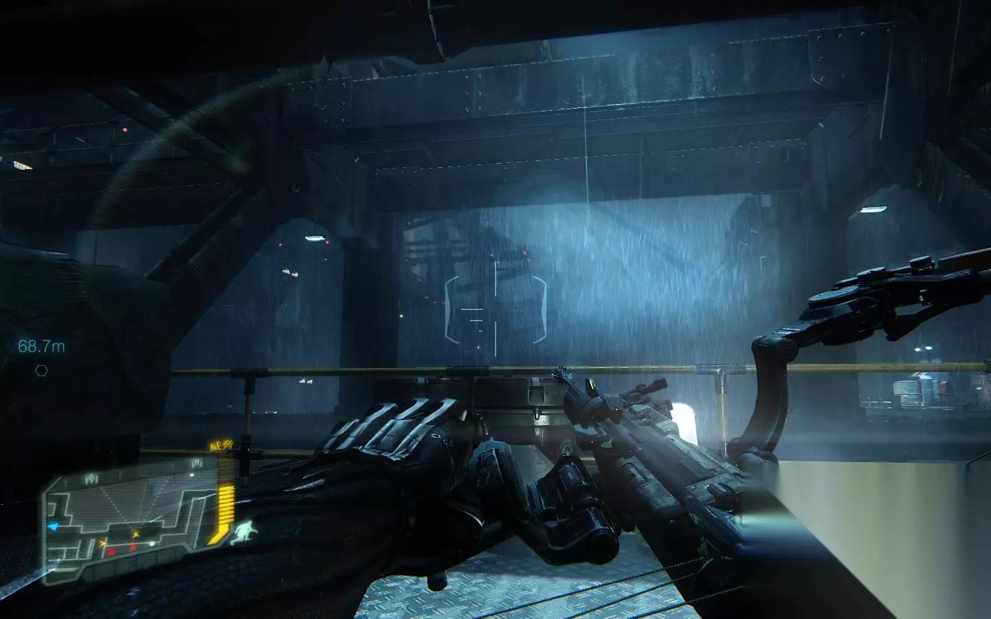 这个地方,先X键,再3键选第一个箭头,两箭即可解决灰机 然后将大门前的敌人干掉,之后来到大门前按F入侵系统开门即可;来到实验区域,这里最好是先按B打开面罩锁定下敌人以确认位置为好。 确认好位置后就可打开杀戒了,当然你也可以选择悄悄的前往目的地。