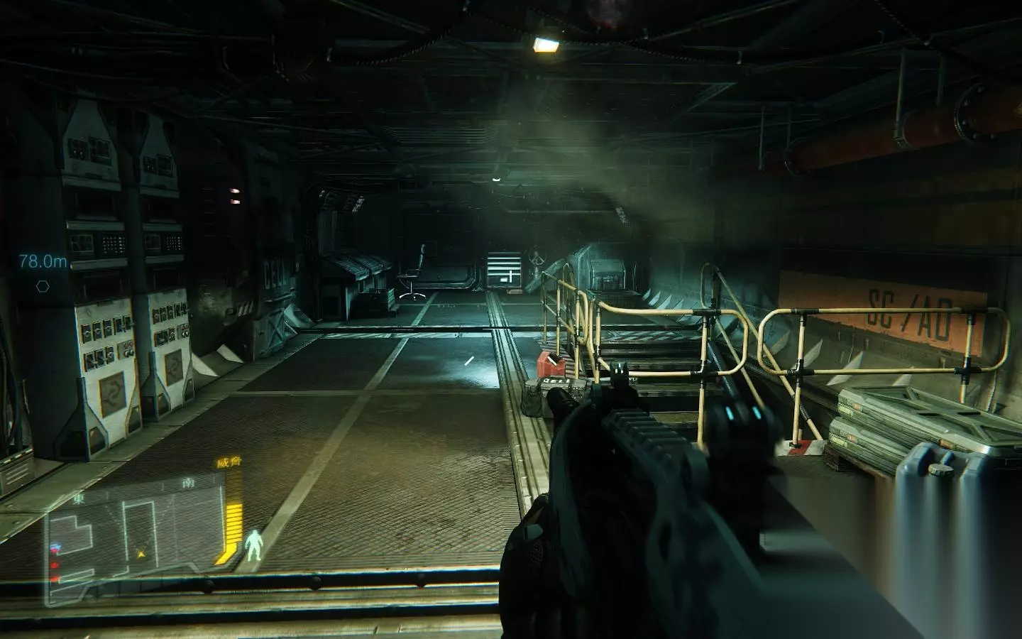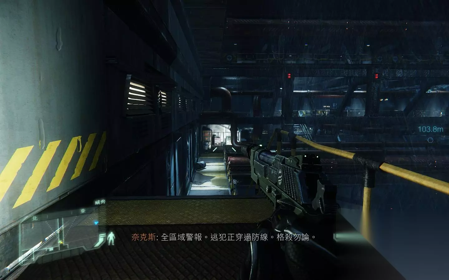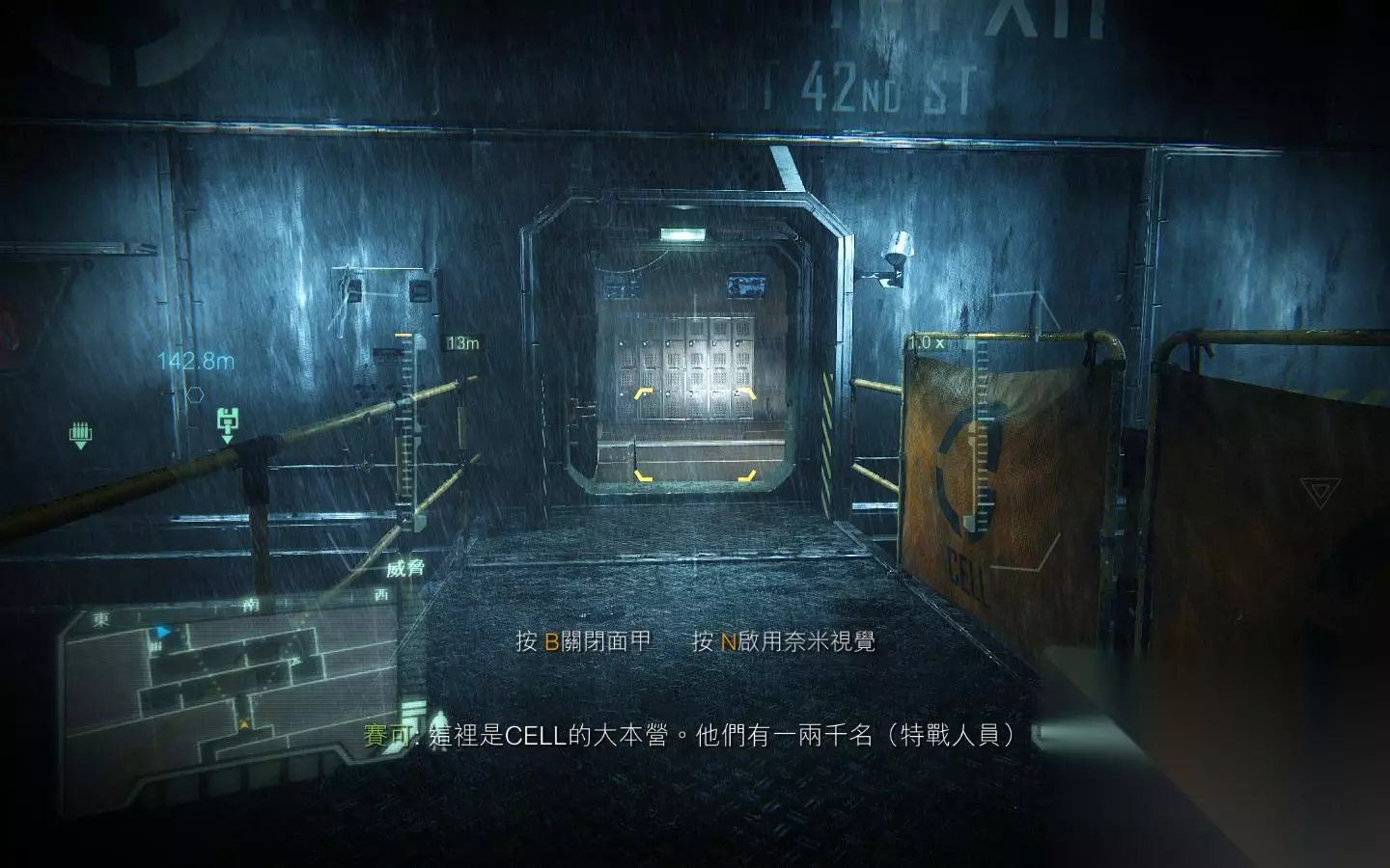 这个地方,先X键,再3键选第一个箭头,两箭即可解决灰机 然后将大门前的敌人干掉,之后来到大门前按F入侵系统开门即可;来到实验区域,这里最好是先按B打开面罩锁定下敌人以确认位置为好。 确认好位置后就可打开杀戒了,当然你也可以选择悄悄的前往目的地。