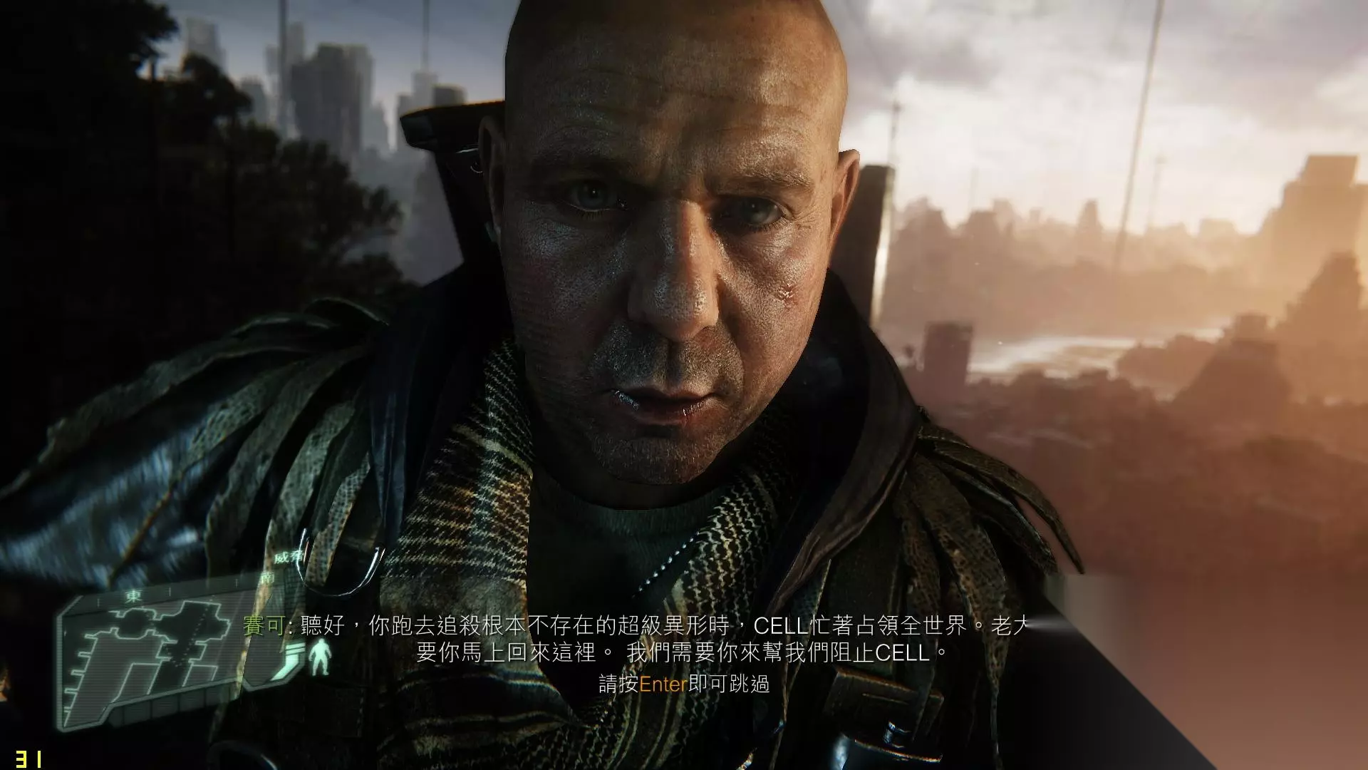 人类灭绝 游戏开始是剧情动画,结束后就被赛给一把手枪,然后跟随赛可前进吧。 我们先看看一些基本按键: E,进入隐身模式;V,实施暗杀;B,打开面罩;F,入侵系统开门; X,可以改造弓箭,可以选择拉弓的强度和不同的箭头; esc键,可以暂停游戏,并查看游戏情节信息等。