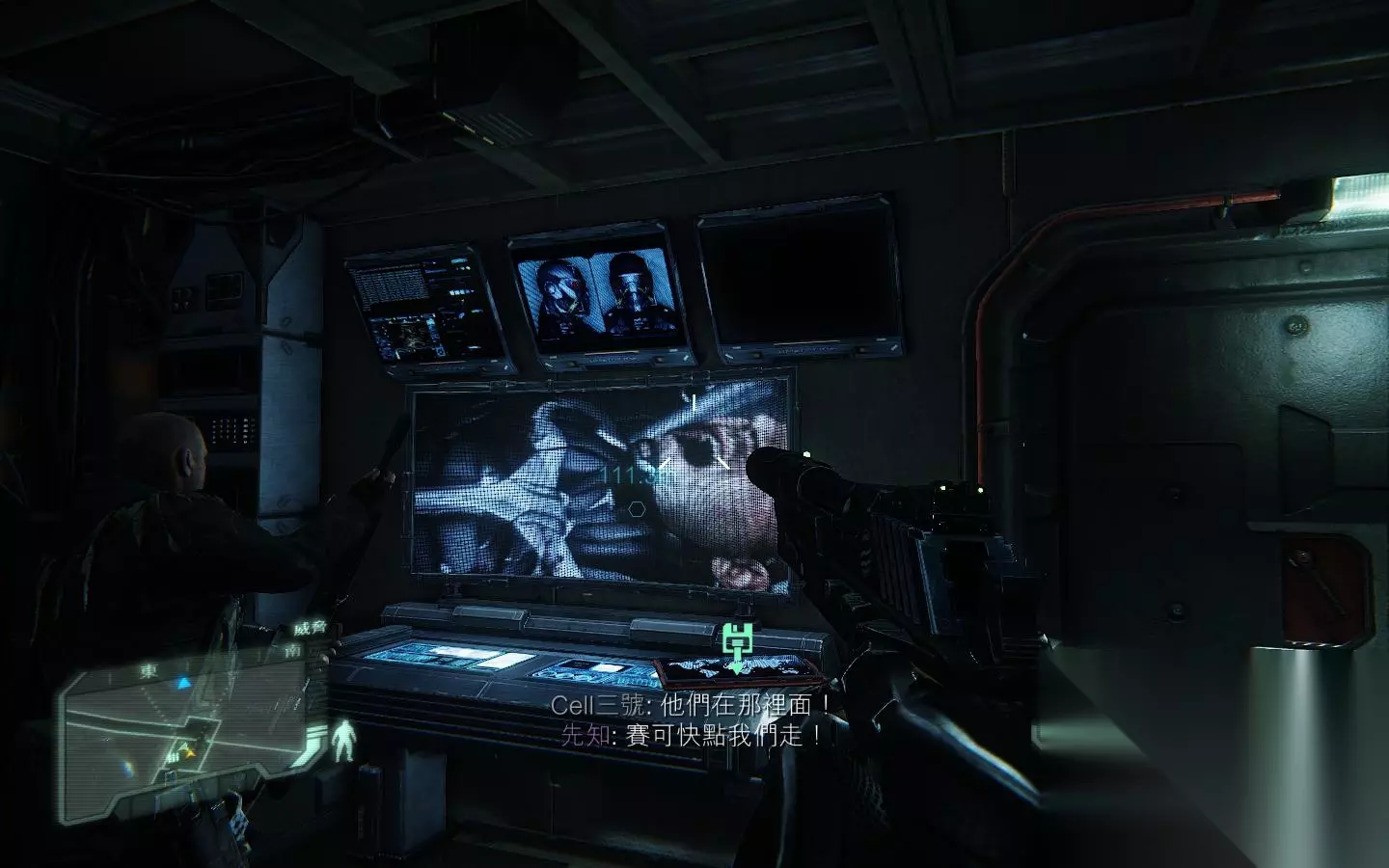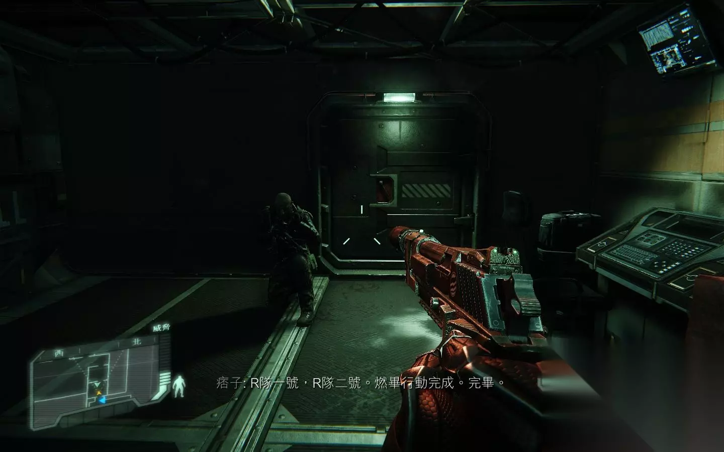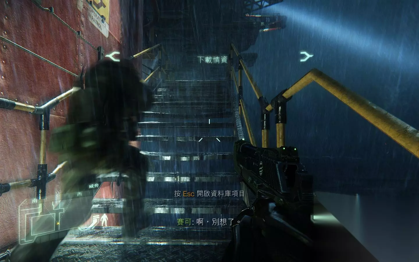 入侵成功后,门打开 进去后,走到控制室什么的,F收集资料;进入目标区域,触发对话。,可以看出两位情绪很激动,被虐视频……接着,赛可开门,来到连接目标区域的走廊处,赛可扛着狙击枪美其名曰掩护,就跑了;