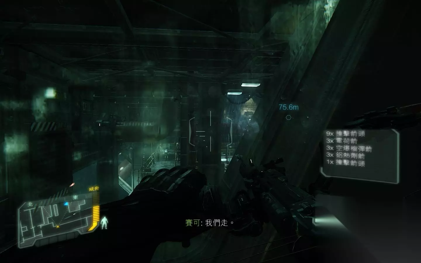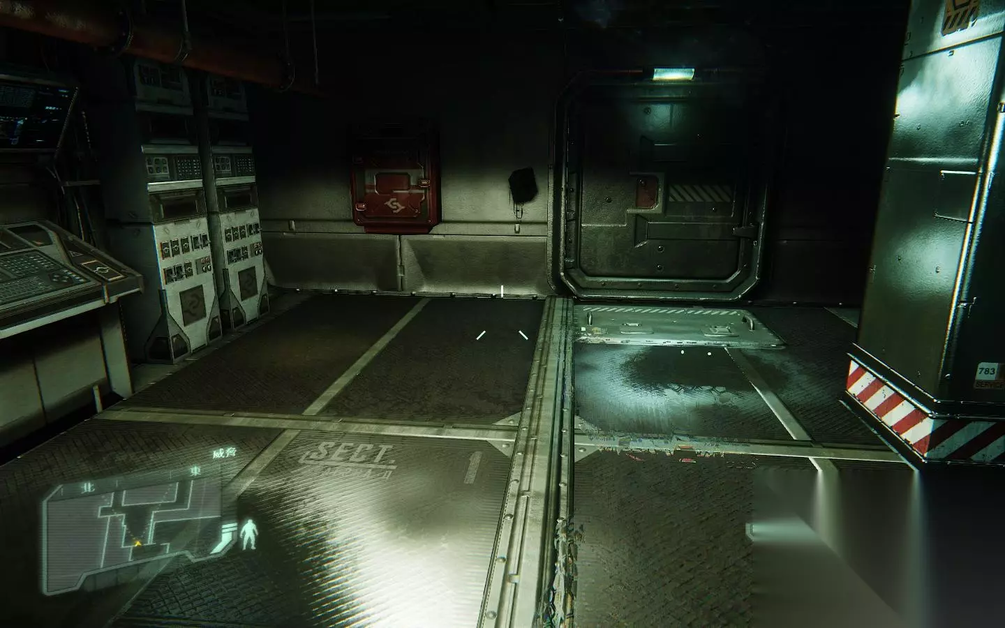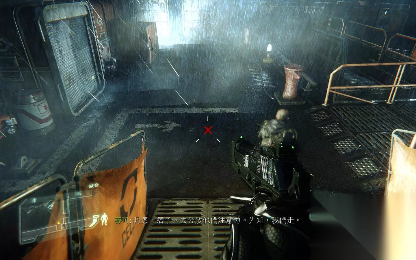 入侵成功后,门打开 进去后,走到控制室什么的,F收集资料;进入目标区域,触发对话。,可以看出两位情绪很激动,被虐视频……接着,赛可开门,来到连接目标区域的走廊处,赛可扛着狙击枪美其名曰掩护,就跑了;