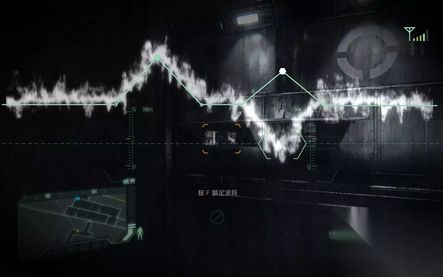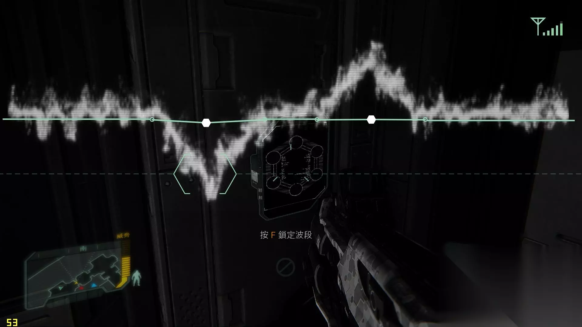 接着,赛可开门。两人来到目标区域的大门前,B打开面罩,瞄准锁头,按F入侵(会有一段操作提示),等波段跳到框内的时候鼠标左键点击即可破解。