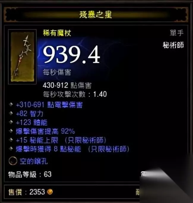 白字:白字也就是一件武器的基础dps,是判断一件装备的一个的关卡,目前优良的单手武器判断原则是800以上白字,极品单手武器1000以上;双手武器白字1300-1500则是相对较好的;镶孔和暴击伤害:镶孔的意义在于可以给武器插上一枚暴击伤害宝石,而暴击伤害因为能大量提升dps,是一把优良的武器的判断标准。所以如果没有这两项的话,可以说基本上不是主流的极品武器。更有甚者,可以牺牲大量的白字dps,换取高额(190%-200%) 的暴击伤害,从而提升整体dps(呕血流巫医等不在讨论范围之内)。击中回复:击中恢复是广泛应用于各个职业build的一个核心属性,主要应用于野蛮人、武僧、以及推熊流巫医等build,如果一把武器附带高额的击中回复(800及以上),那么其价值也会大大提升。主属性和体能:锦上添花的属性,但是如果没有上面的这些主要属性,单单有高额的主属性和体能是卖不出高价的。这里主要介绍的是主流武器的价值判断,所以可以说,一把白字不突出,没有击中恢复和暴击伤害的武器,是基本不会成为一把高价的dps武器的。武器分析进阶研究:判断一把基本的好坏,可以通过上面的方式,下面给大家分析的是武器的其他一些估价标准,因为基本都涉及到个别职业,所以写到进阶研究里面,供大家在自我选购时分析利弊。