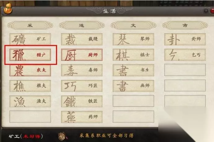 4、按I打开生活技能窗口,即可看到,你成为了猎户