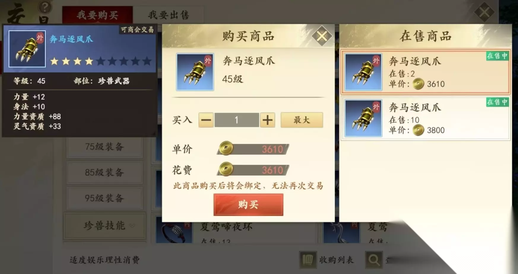 现在大家知道新天龙八部手游珍兽装备怎么获得了吧,如果手中拥有充足的金币,那么完全可以直接在交易行中购买,这样更加简单也节省精力。但如果想自己制作就去学习相应副职业,不仅满足需要还能出售出去。