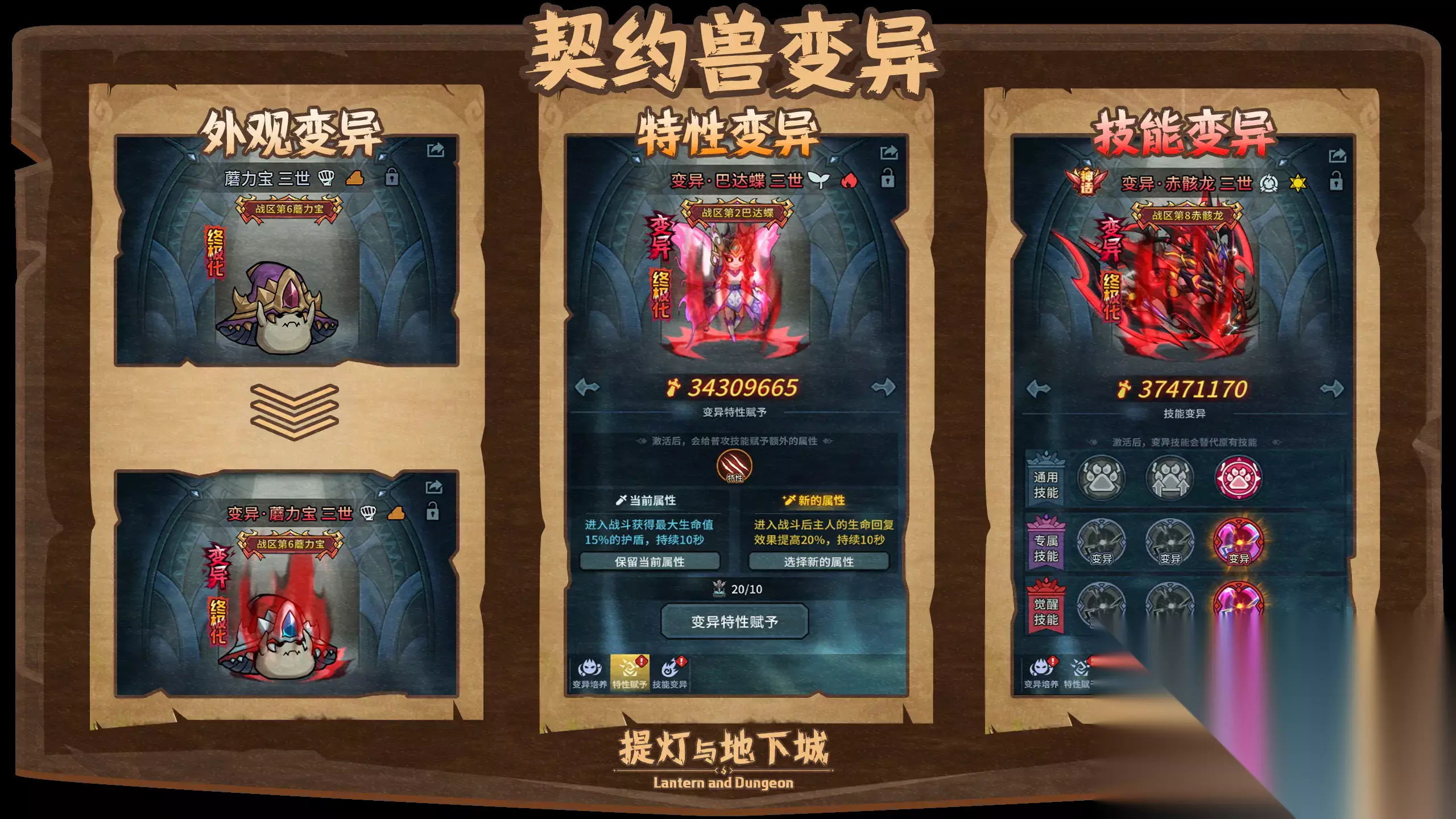 (图片为开发中截图,具体请以正式服上线为准) 特性赋予: ①变异培养三世三觉可解锁 ②消耗材料对契约兽的普攻技能赋予新的效果(效果太多,五郎挑花了眼) ③当给契约兽赋予特性后,即可达成变异,此时契约兽的形象会发生改变(五郎也想变帅)