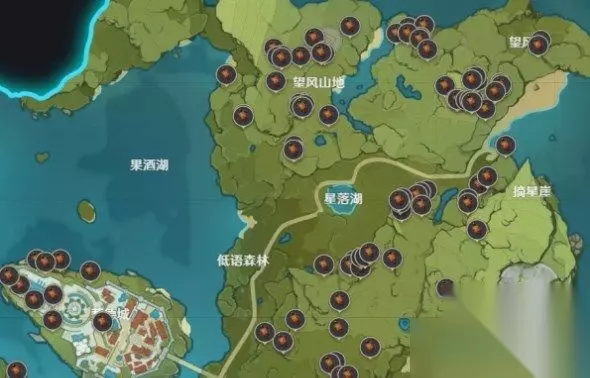 3、星落湖、低语森林、蒙德城等,这几个地区也能轻松的找到松果果树。