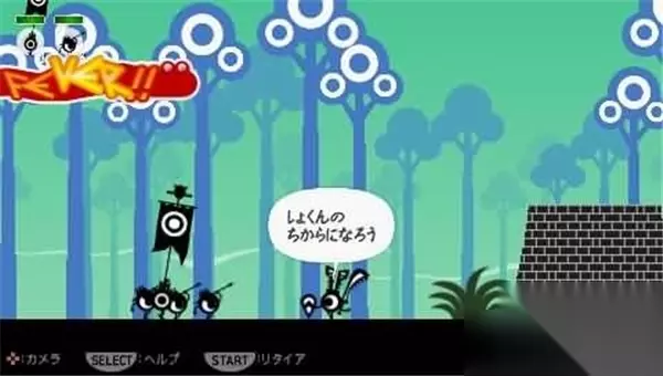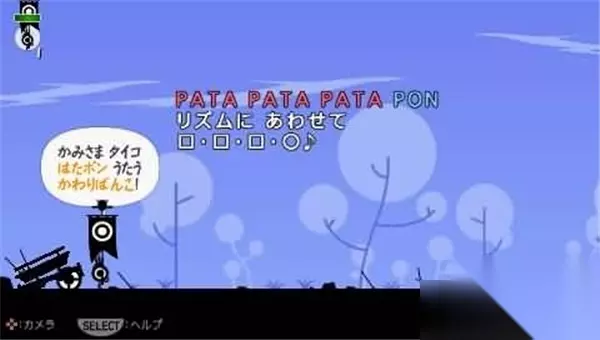 欢迎来到Patapon!在这里,只需跟随背景音乐的节奏,指挥“烧饼”们前进和进攻。按“O”键让旗手站起,注意画面边框闪烁来找到节奏。学会节拍PATA(按“□”键),我们学到第一个命令:前进!PATA PATA PATA PON(□/□/□/O),按下键就让烧饼们前进。 第一章 MISSION 1 序