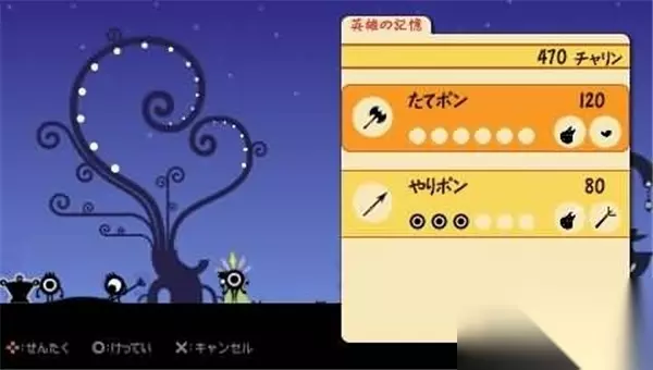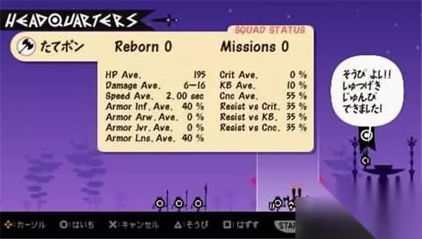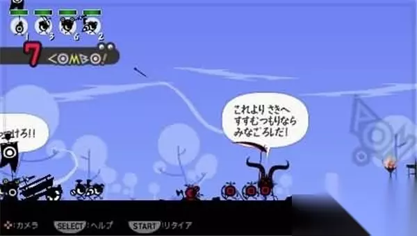 在纪念碑区,按下O键即可进入Patapon的世界进行冒险。 选定关卡后,将进入整备界面。然而,同志们请注意,当前我们依然处在社会主义初级阶段——没有士兵、没有房屋、没有武器、没有食物,什么都没有。也就是没有什么可整备的,直接按START键进入吧。 在这一路上,我们学到了第二个指令:进攻!PON PON PATA PON O/O/□/O。灵活运用进攻和前进这两个命令,边前进边狩猎,就能顺利通过关卡。完成任务后,你将根据猎物数量获得一定的肉LV1,这可是制作新烧饼的必备材料哦! 第一章 MISSION 3:边境突出