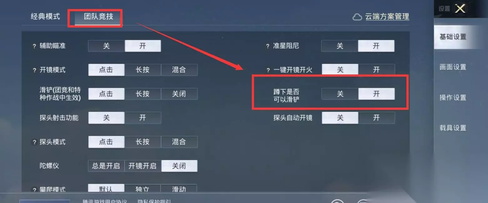第三步: 在设置菜单中选择【团队竞技】分类,找到【蹲下是否可以滑铲】选项并启用。