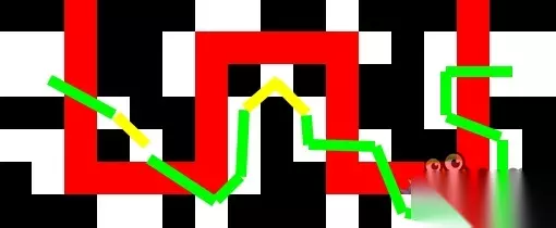 接下来就是第三个考验——机关石柱 相信不少刷黑天的小伙伴都被这里难住了 毕竟石柱又多又乱,一个不小心就会掉下去。 但是再乱终究是有方法可循的 下面就是楼主精(xia)心(jb)制作的石柱分布图哦! 我们从左边出发,目的地在右边。黑色的代表障碍,红色的代表深渊,白色的是可以到达的地方,绿色和黄色的线是我们的路线,为什么有黄色的?接下来会说。