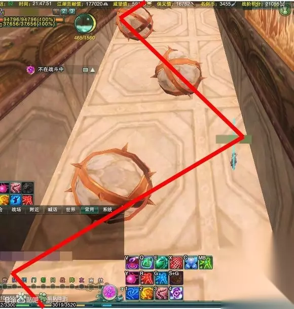 跳下去我们就来到了第一个关卡——滚石通道。 被滚石砸到会掉血并眩晕…… 但是经过观察我们可以发现,这些滚石都是按照折现有规律的运行的,如红线所示: