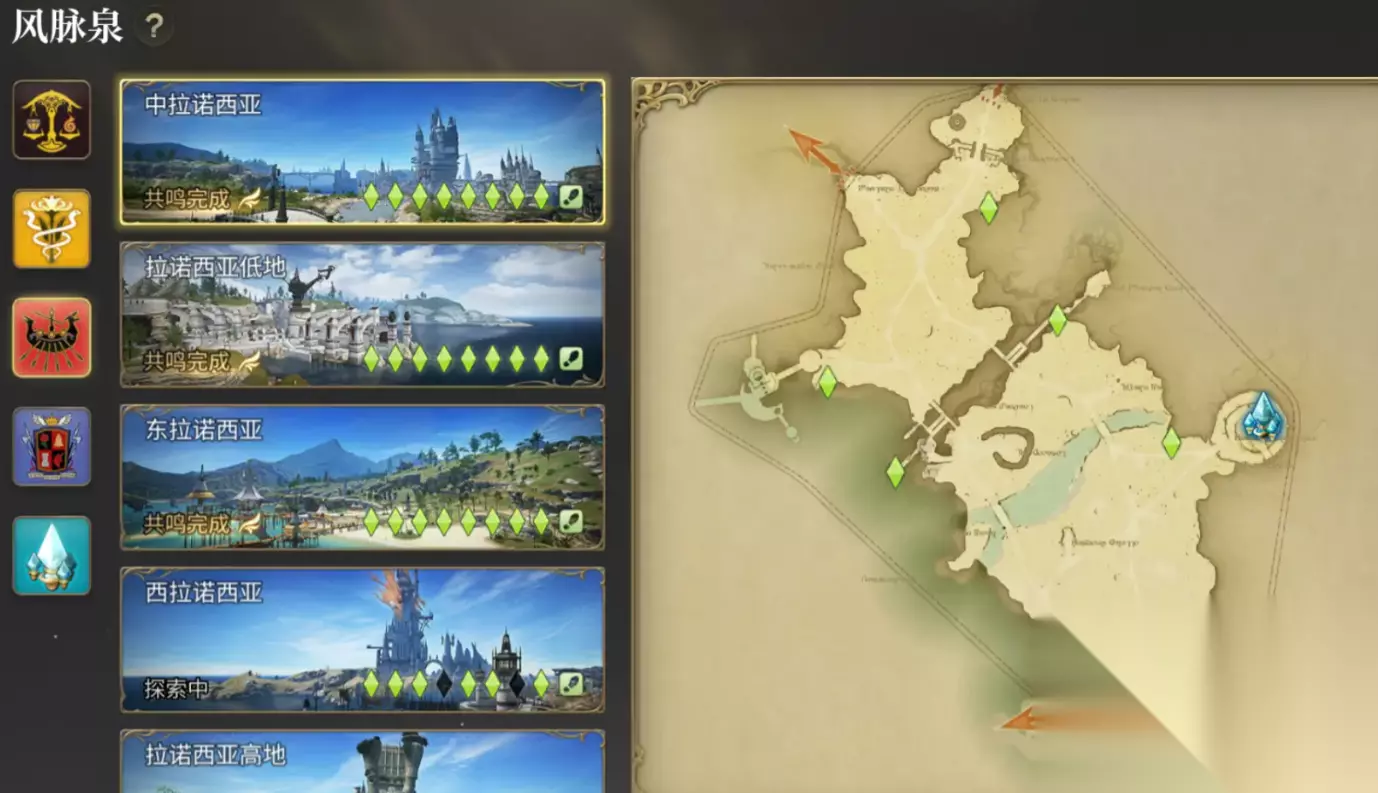 想要找风脉泉也很简单,大家在主界面点开右上方的地图,接着再点击风脉图标,就能看到根据不同主城划分,各个地图上的风脉数量,以下图所示大家能看到西拉诺西亚是8个,我们顺利找到就会让标记点亮,差几个就会有几个空缺。