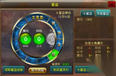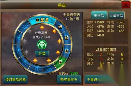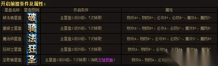 天赋星盘系统 当星盘功能中间的主星盘达到特定等级和 其他条件后,可以开启多个职业的天赋星盘(右侧的破、骑、法、狂、圣)。