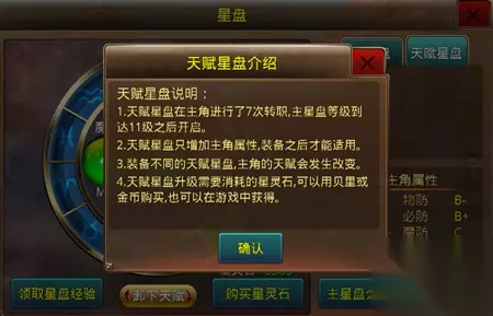 天赋星盘说明: 天赋星盘在主角达到70级,进行了第七次转职之后开启。 天赋星盘只增加主角的属性,需要装备之后才能在使用。 装备不同天赋星盘,主角的天赋会发生变化。 天赋星盘升级需要的星灵石,可以通过贝里和 金币购买。