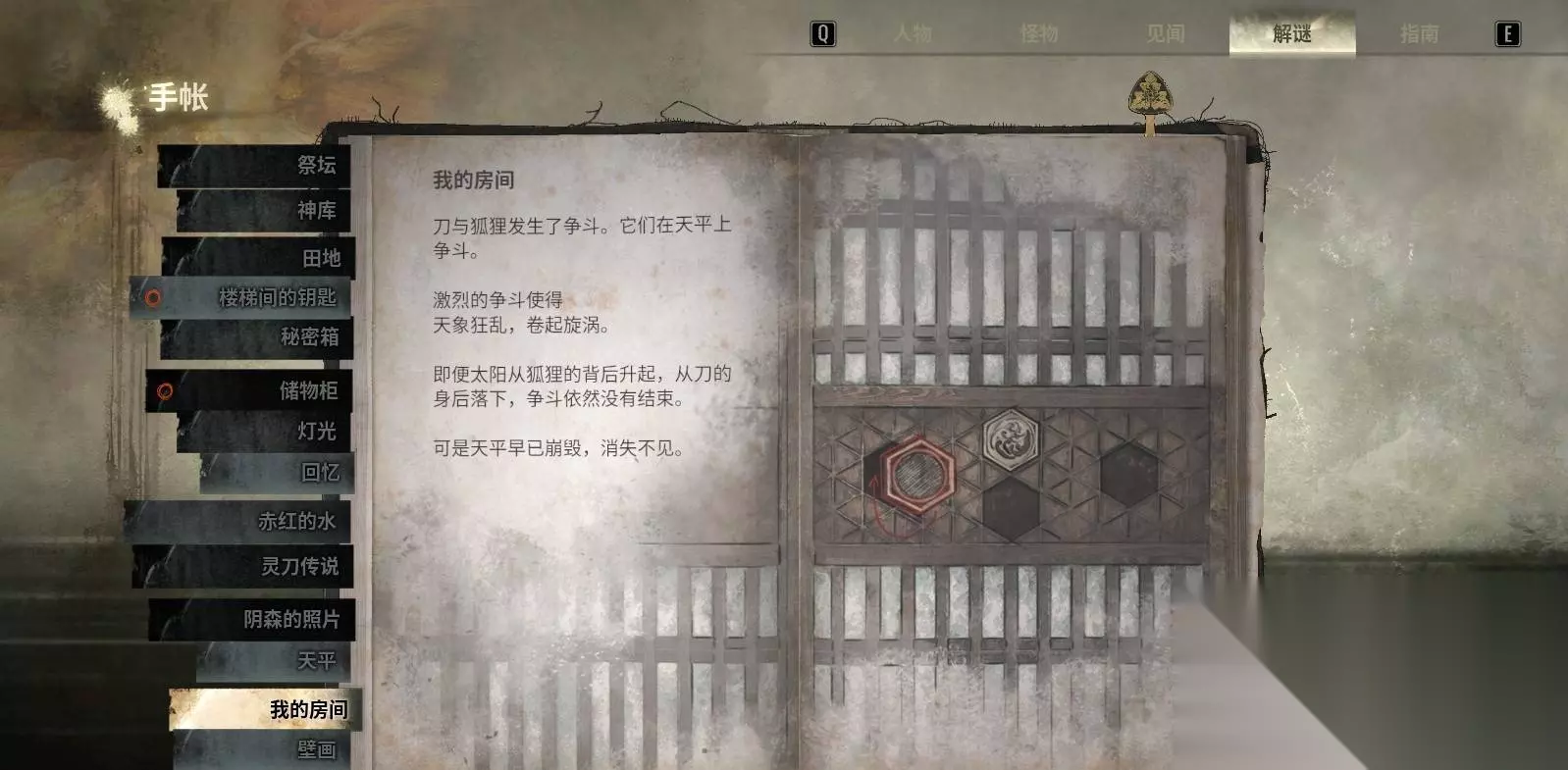 5.3 我的房间:纹章摆放 找到 3 枚纹章(候选项包含:刀、狐狸、漩涡、天平、黑雀、白雀等),将其中三枚放在雏子房门前的 4 个位置(左 / 右 / 上 / 下)。部分纹章需要按 □ 键翻转,(翻转后纹章可能会变化,例如:刀纹章翻转成黑雀,狐狸纹章翻转成白雀)。