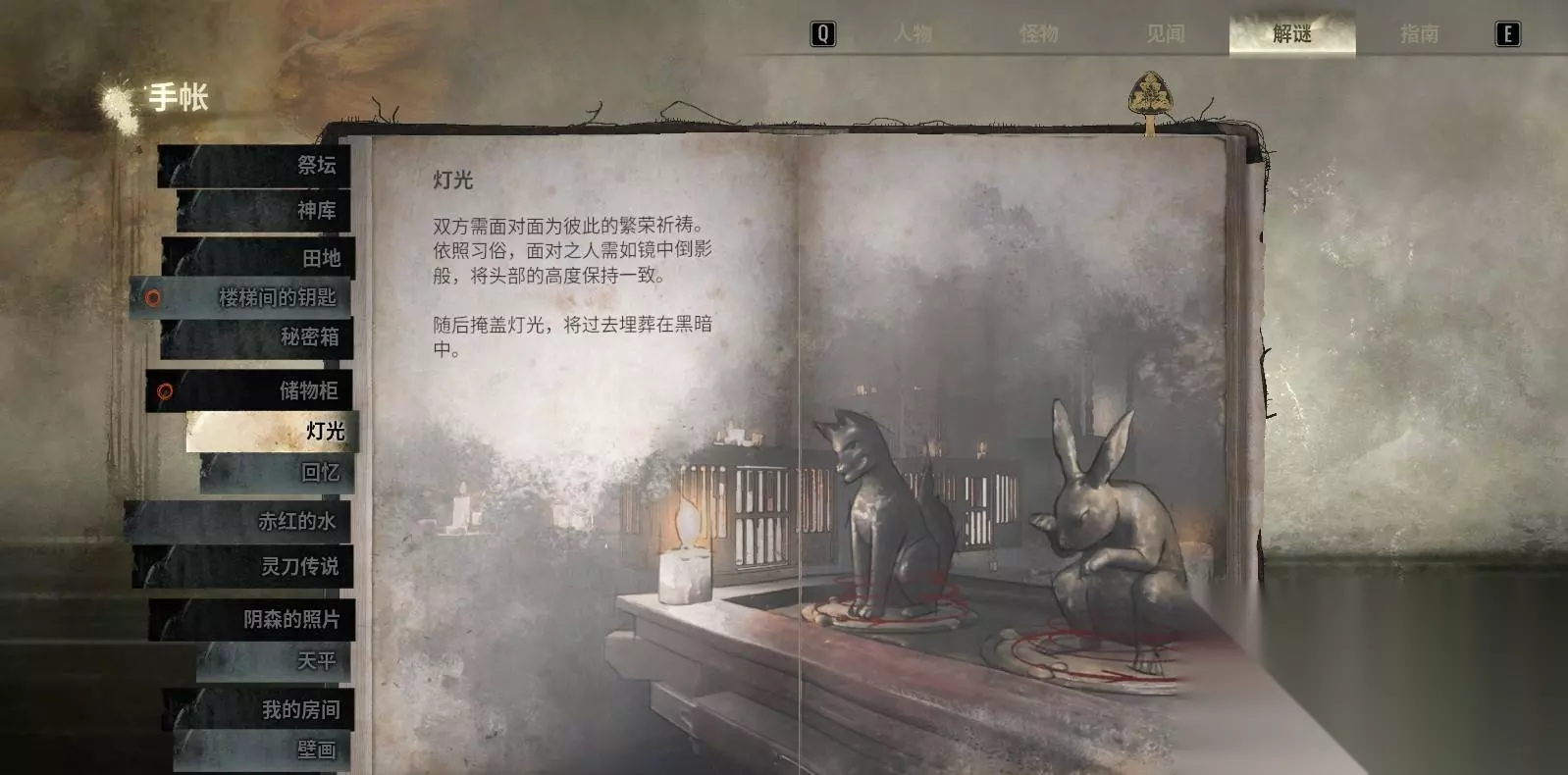 四、拜殿区域谜题(灯光 + 回忆收集) 拜殿围绕两类玩法:雕像朝向的灯光解锁与回忆(道具)收集。 前者是传统拼装/朝向谜题,后者是收集放置型。 4.1 灯光谜题:雕像朝向与灯罩获取 两个平台(左右各一个)上各有一对兔子/狐狸雕像。通过旋转雕像使笼子保持水平,从笼中取出灯罩,最终合成钥匙。