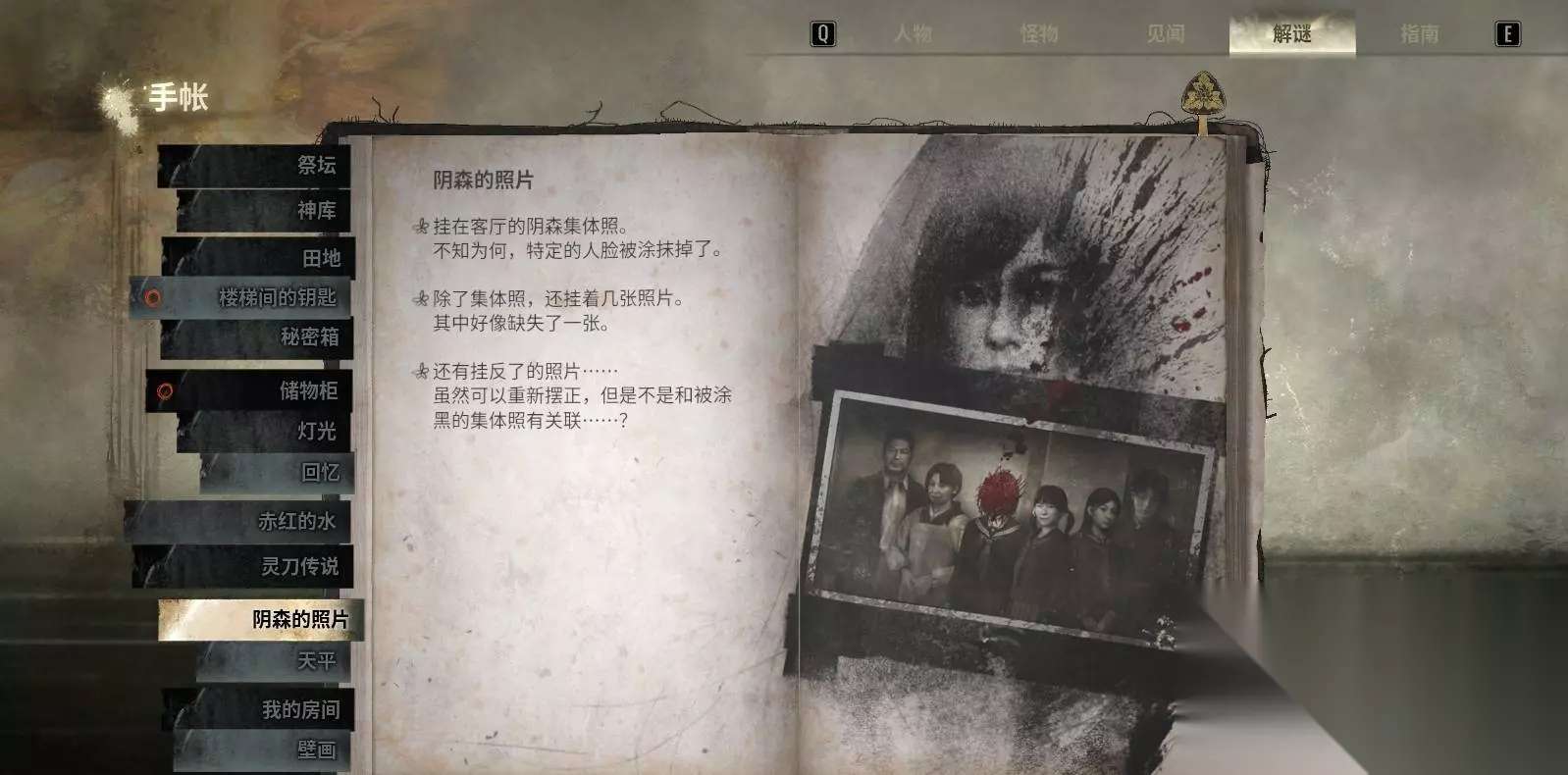 5.2 阴森的照片:正/倒摆放 把“雏子”的照片放入照片房的空位,并将所有照片按“正放 / 倒放”的顺序排列,排列形式将影响结局走向。 注意记录每张照片当前的“正或倒”,放入后若不匹配结局要求需用章节回溯重新调整。