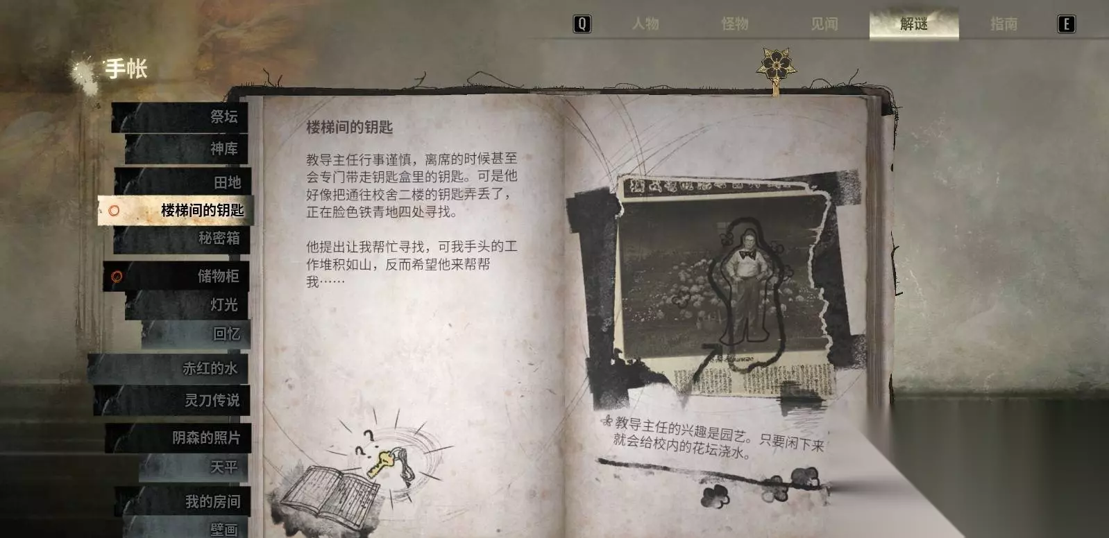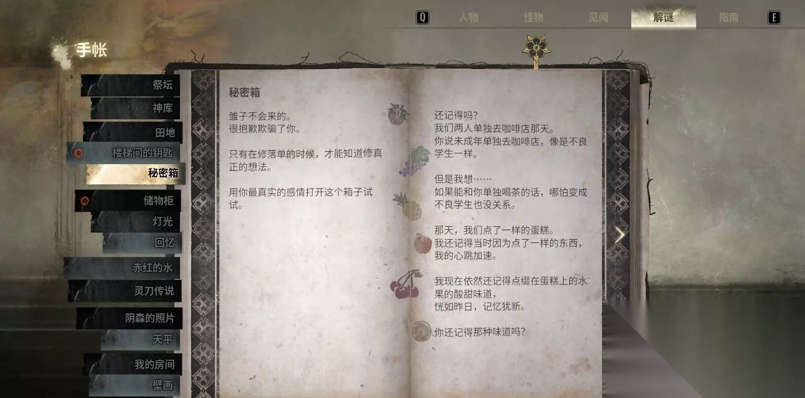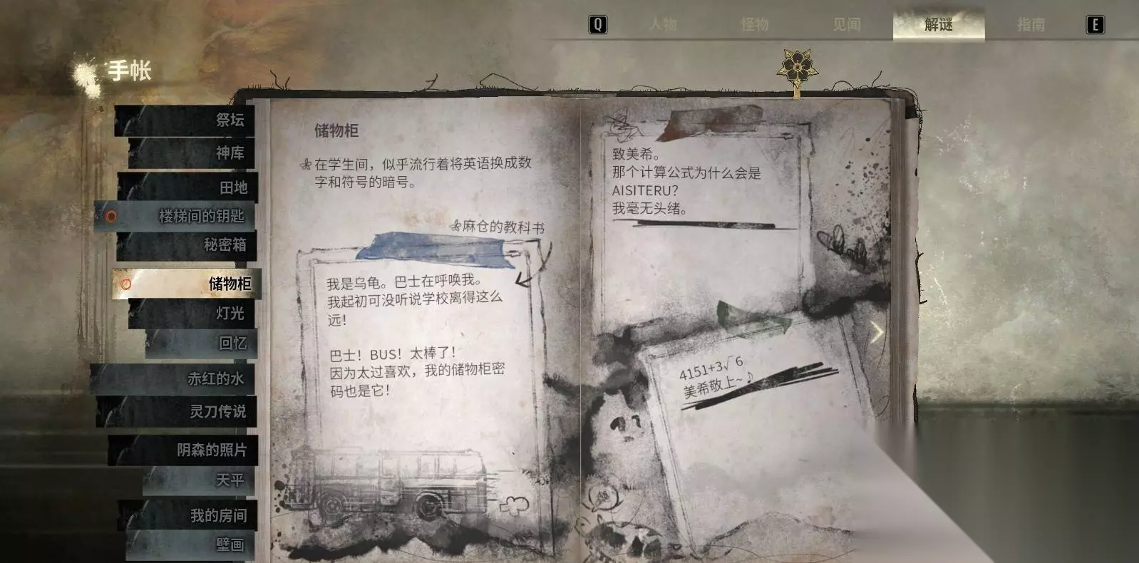 3.1 楼梯间的钥匙:多条获取路径(随难度切换) 获取能打开校舍二楼的钥匙。路径随难度不同而变化。 1、故事难度(“发夹解锁”路径) 进入校内唯一开着的教室,拾取 皱纸团(纸团提示可用发夹解锁抽屉)。 从教室窗户爬出到室外,找到角落的 兔笼,在兔笼内的篮子中拾取 发夹。 回到教室,用发夹打开教师储藏室的上锁抽屉,拿到 二楼钥匙。 2、难关难度(“室外蓝花”路径) 从教室窗户爬出到室外。 前往室外西侧,找到一片 蓝色花丛,在花丛中直接拾取 二楼钥匙(无需发夹)。 3、迷失雾中(“室外楼梯 + 蓝花盆栽”路径) 爬出教室窗户到室外。 前往西侧并登上楼梯,向东(右手边)行进,找到 蓝花盆栽。 在蓝花盆栽旁拾取 二楼钥匙。 小提示:若找不到钥匙,优先检查窗户能否爬出及西侧楼梯通路是否被阻挡(迷失雾中路径常有视觉误导)。 3.2 秘密箱谜题:三层滑动解锁(面与行的定义) 秘密箱分三层,每层解开后会给出下一层提示。先理解“面/行”定义: