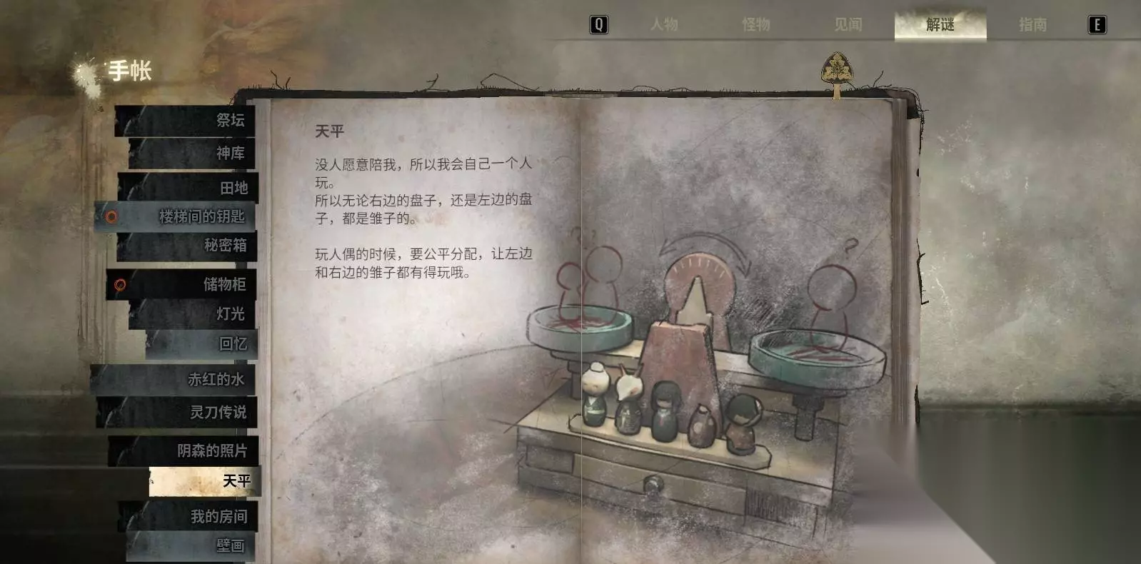五、深水家区域谜题(结局分支关键) 深水家是结局分歧的核心区域,所有谜题(天平、照片、房间纹章)都会随四种结局的要求而变化——想要指定结局必须按目标结局的方法解谜。 5.1 天平谜题:玩偶平衡 将五个玩偶(无头玩偶、半面具玩偶、雏子玩偶(蓝衬衫)、以及其它普通玩偶)放到天平两侧,并调整到平衡状态以解锁下一步。 不同结局对左右分配有不同要求,摆放前最好先存档或记录目标结局所需的摆放方案。