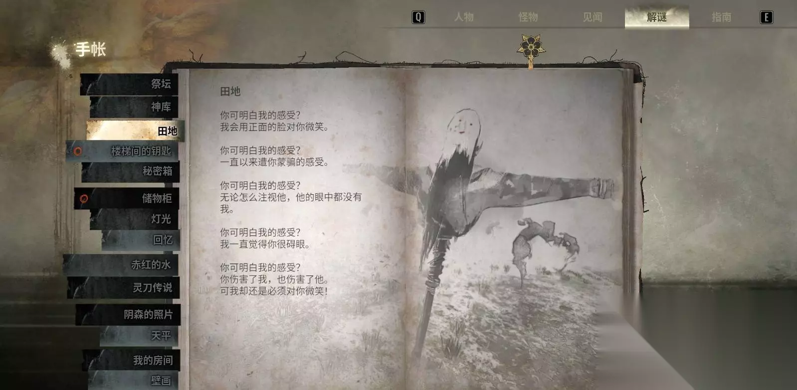 2.1 故事难度(匹配“雏子特征”) 目标特征:短发、系红色领结(即“雏子模样”)。各区域对应位置如下: 第一区域(左侧):手持镰刀的稻草人(短发 + 红领结)。 第二区域(中间):不拿镰刀的稻草人(短发 + 红领结)。 第三区域(右侧):头朝下的稻草人(短发 + 红领结)。 第四区域(中间):双臂张开、侧头的稻草人(短发 + 红领结)。 第五区域(区域后方):像被钉在十字架上一样挂着的稻草人(短发 + 红领结)。 2.2 难关难度(匹配“雏子朋友特征 + 区域提示”) 除第五区外,正确稻草人需符合“雏子朋友”特征,具体位置与特征: 第一区域:目标在起始稻草人左后方,面带微笑且后脑勺有面具的稻草人。 第二区域:中间,背部插着一把镰刀的稻草人。 第三区域:后方,唯一不被其他稻草人注视的稻草人(观察周围稻草人的朝向,选那个无人注视的)。 第四区域:右侧,皱眉的稻草人。 第五区域:中后方,像被钉在十字架上挂着,背部插着镰刀的稻草人。 2.3 迷失雾中(匹配“区域提示”) 迷失雾中更依赖环境隐藏提示,按提示找到对应稻草人: 第一区域:目标在起始稻草人左侧,头朝下的稻草人。 第二区域:区域后方,像被钉在十字架上、镰刀插在地上的稻草人。 第三区域:在倒在地上的“稻草人尸体”后方的、没拿镰刀的稻草人。 第四区域:中间,先找到“相互对视的修与凛子稻草人”,目标就是二者的正中间那根稻草人。 第五区域:田地里有四具尸体,沿着尸体手臂指向的方向去寻找,目标是那孤零零的稻草人。 实战提示:迷失雾中要多看环境标识(尸体、对视、手势),不要只盯着稻草人体型。 三、戎之丘中学区域谜题(钥匙 → 秘密箱 → 储物柜) 中学部分包含三大独立谜题,需要按顺序推进:先取到二楼钥匙,再解秘密箱,最后用纸条线索解开储物柜密码。