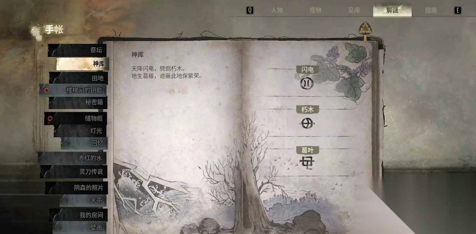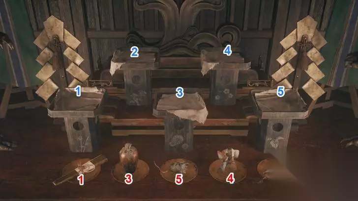 4、迷失雾中(以纸条的植物象征提示为线索,直接按顺序摆放) 线索来源:纸条直接暗示“物品对应植物”,无需再查底座图案。 标准摆放(迷失雾中): 【左后】→ 鱼 【右后】→ 鼠 【左前】→ 纸扇 【中前】→ 和服 【右前】→ 花瓶 如果不确定顺序,可先把容易辨认的底座物品放上,剩下两个通过排除法确认。 1.2 神库谜题:绘马符号解锁 在神社内寻找特定图案的绘马,按 L1 + × 将绘马翻转,记录出现的符号(符号会自动写进手帐),这些符号用于神库门的解锁。