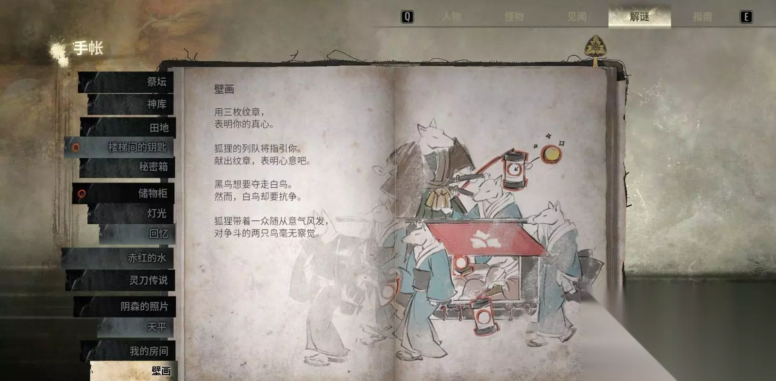 操作要点: 先按 △ 检查纹章图案,确认哪一面是目标图样; 若需要翻转,再按 □ 做面朝向调整; 放置时注意“位置 + 图案”必须严格对应目标结局要求。 强烈建议:深水家相关步骤前务必多存档以便回溯验证不同结局。 六、宝物殿区域谜题(结局补充) 宝物殿的壁画谜题是结局路线的最后补充环节,用来精确锁定结局细节。 6.1 壁画谜题:纹章放置规则 在壁画上找到 3 个空位(空位位置随不同结局会变),把三枚纹章(如狐面纹章、白雀纹章、黑雀纹章)按“位置 + 图案”要求放入。当三枚都正确放置后会触发解锁。 放置前可以按 △ 检查纹章的细节(例如“狐狸是举灯还是提灯”),小差异会导致判定失败。
