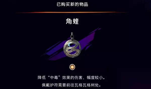 角蝰护符能力: 降低“中毒”效果的伤害,但该护符给予玩家的增幅较小,且佩戴护符需要前往瓦格瓦格树处。