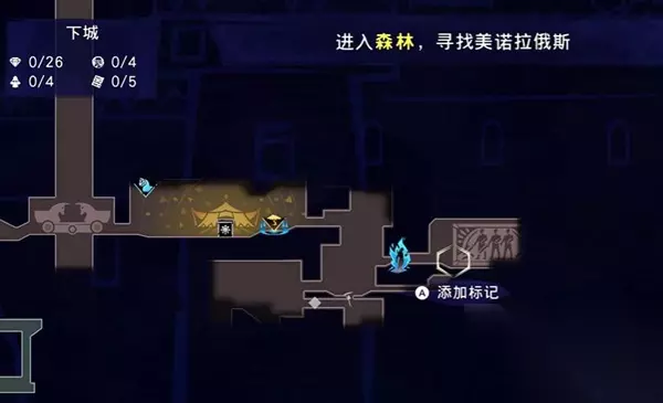 2、玩家前往下城如图所示的位置,到达后往右侧走进去空间内,将闪着黄色光芒的物品击碎。