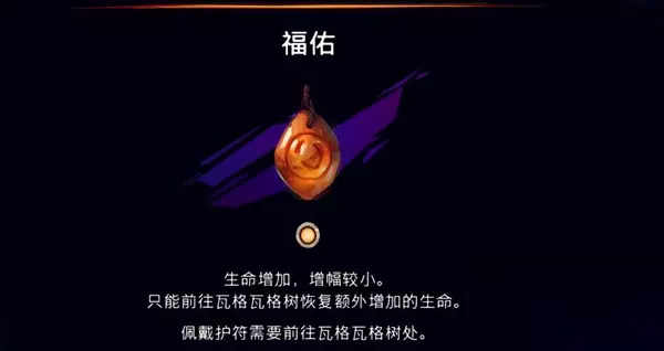 2、玩家推图至法师所在位置,靠近法师与之交互对话即可获得福佑护符。 福佑护符效果介绍: 生命增加,但该护符给予玩家的增幅较小。需要注意的是,玩家只能前往瓦格瓦格树恢复额外增加的生命,且佩戴护符需要前往瓦格瓦格树处。