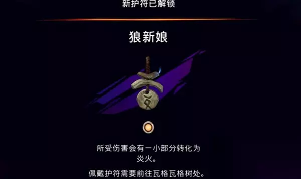 2、玩家推进剧情至遭遇厄里克,将其击杀后,拾取掉落物即可。 3、厄里克的主要攻击手段为横冲和液体攻击,玩家注意左右躲避即可,难度不高。 狼新娘护符效果介绍: 所受伤害会有一小部分转化为炎火,但佩戴狼新娘护符需要前往瓦格瓦格树处。