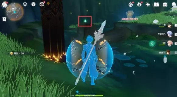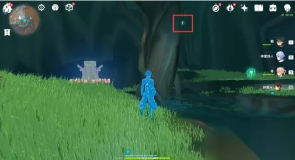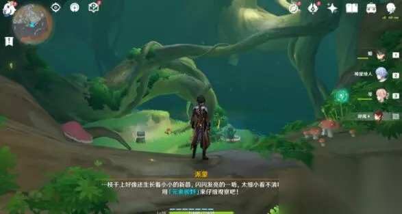 2、往里走旅行者可以看见一棵大树和三个被封印的元素方碑。 3、通过派蒙的提醒,旅行者可以开启元素视野找树干上的新苗。