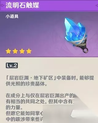 二、【层岩巨渊寻访记】其二任务 《方入巨渊初探勘》任务攻略:>>点击查看<< 1、初次进入层岩巨渊地下矿区需要调查营地附近的流明晶石,之前获得的人物道具【流明石】会变成仅在层岩巨渊地下矿区可使用的道具“流明石触媒”。