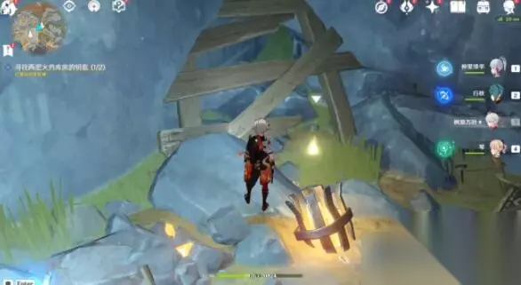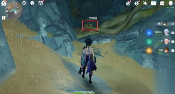 五、【层岩巨渊寻访记】其五任务 《灵石何故堕此间》任务攻略:>>点击查看<< 1、来到下图点位处(在高处,可跟随仙灵过来,别去下面找),攻击炸药桶炸开岩石。