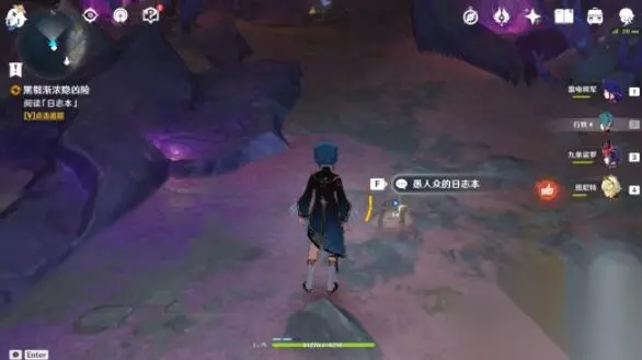 (营地处还有一个风漩涡状的洞口,可通往层岩巨渊地表的一处闸门密室内部,有一个华丽的宝箱,同时解锁成就:只要一些柴火、一些醋) 四、【层岩巨渊寻访记】其四任务 《黑翳渐浓隐凶险》任务攻略:>>点击查看<< 1、调查眼前的黑雾,并在附近找到愚人众的日记本。
