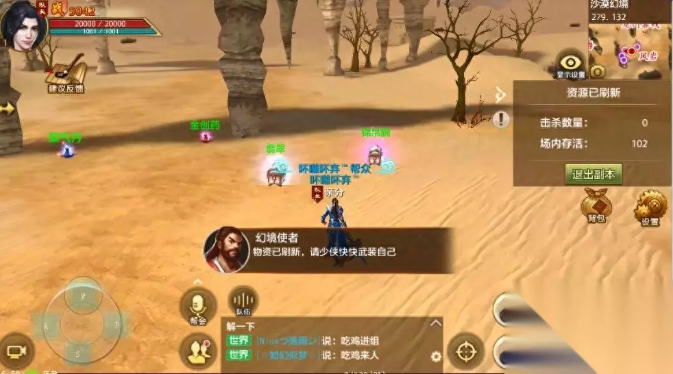 《天龙八部手游》周年庆典期间推出的沙漠幻境是一个组队活动,人多力量大这句话在活动中是绝对的真理!最后成功吃鸡的队伍几乎都是组满5人的小队,但是5人小队也许并不需要从开局就集中在一起,大家各自选不同的征战地点,全图捡装备,最后再集合,也许是更好的玩法。